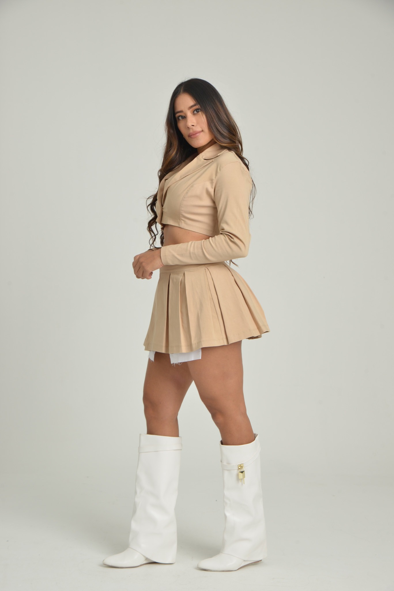 Conjunto en drill strech compuesto de mini blazer y falda con prenses.